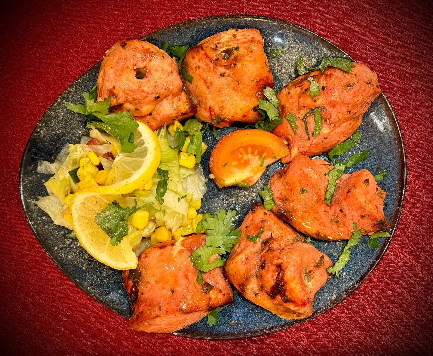 Morceaux de saumon mariné au yogourt et épices puis grillés.
