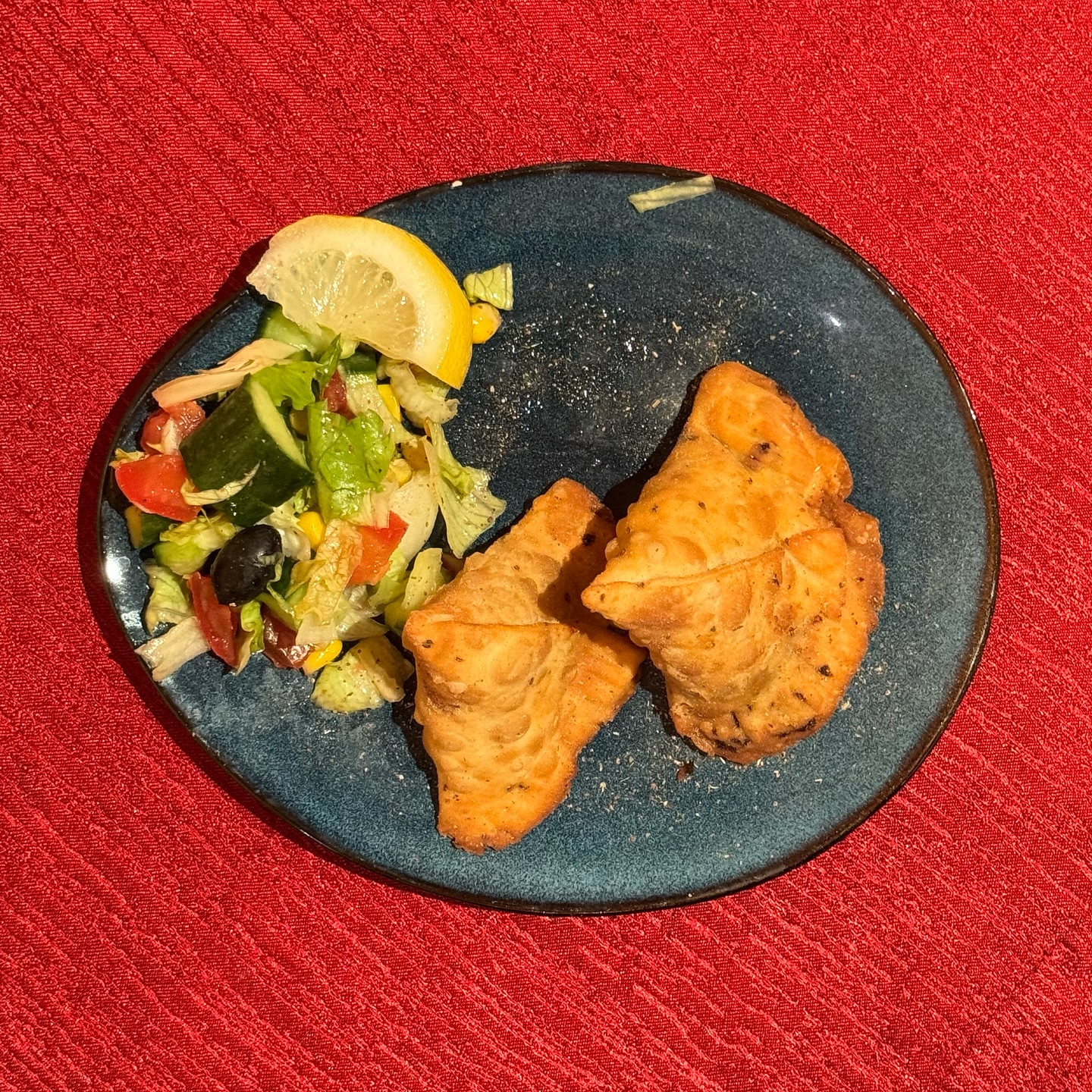 Triangles de pàte farcis d’agneau haché épicé avec curry de pois chiches.